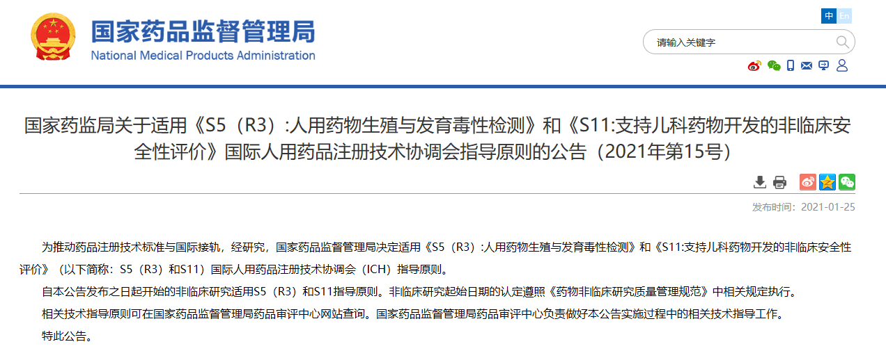 關于適用《S5(R3):人用藥物生殖與發(fā)育毒性檢測》和《S11:支持兒科藥物開發(fā)的非臨床安全性評價》國際人用藥品注冊技術(shù)協(xié)調(diào)會指導原則的公告(2021年第15號)