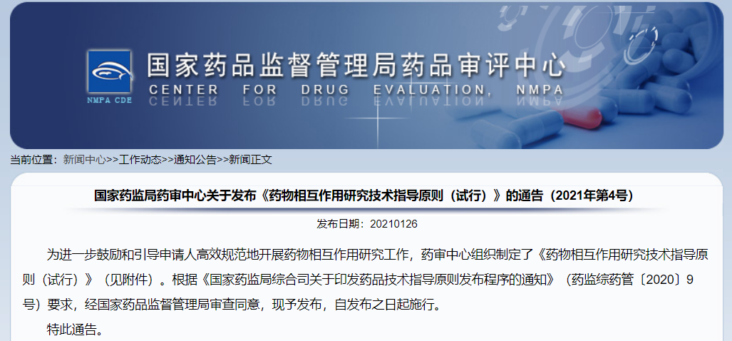 關于發(fā)布《藥物相互作用研究技術(shù)指導原則(試行)》的通告(2021年第4號)