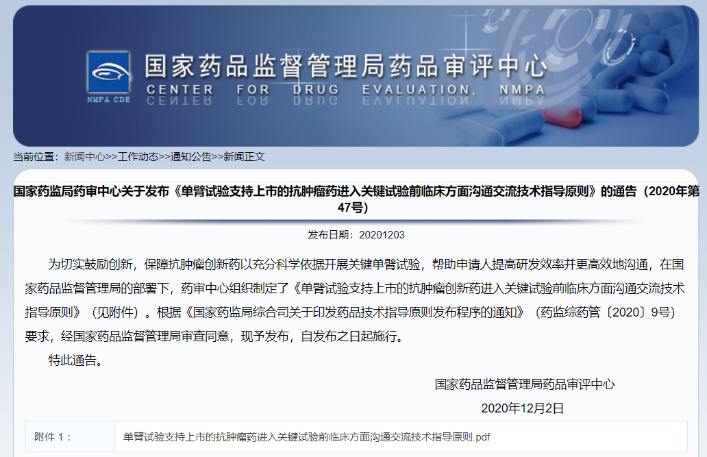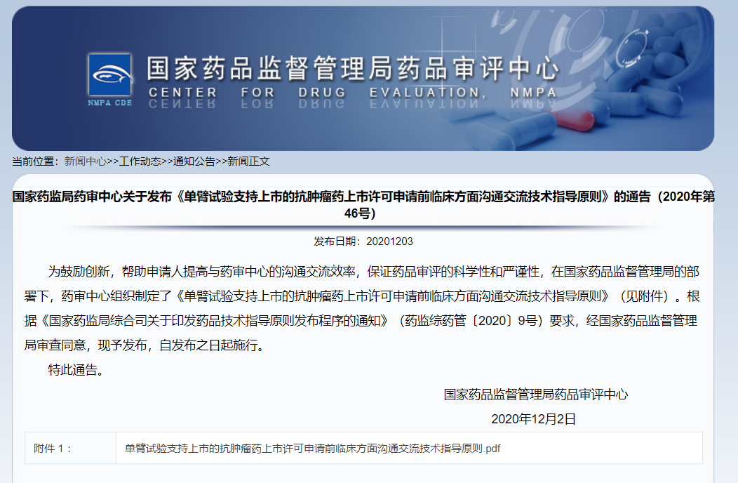 《單臂試驗(yàn)支持上市的抗腫瘤藥上市許可申請(qǐng)前臨床方面溝通交流技術(shù)指導(dǎo)原則》的通告(2020年第46號(hào))