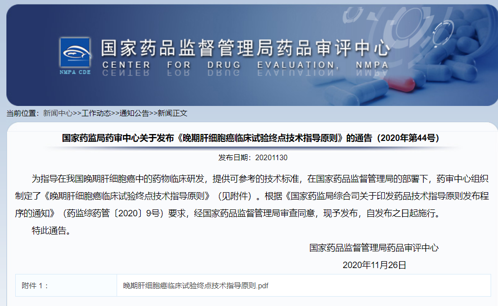 關(guān)于發(fā)布《晚期肝細(xì)胞癌臨床試驗(yàn)終點(diǎn)技術(shù)指導(dǎo)原則》的通告(2020年第44號(hào))
