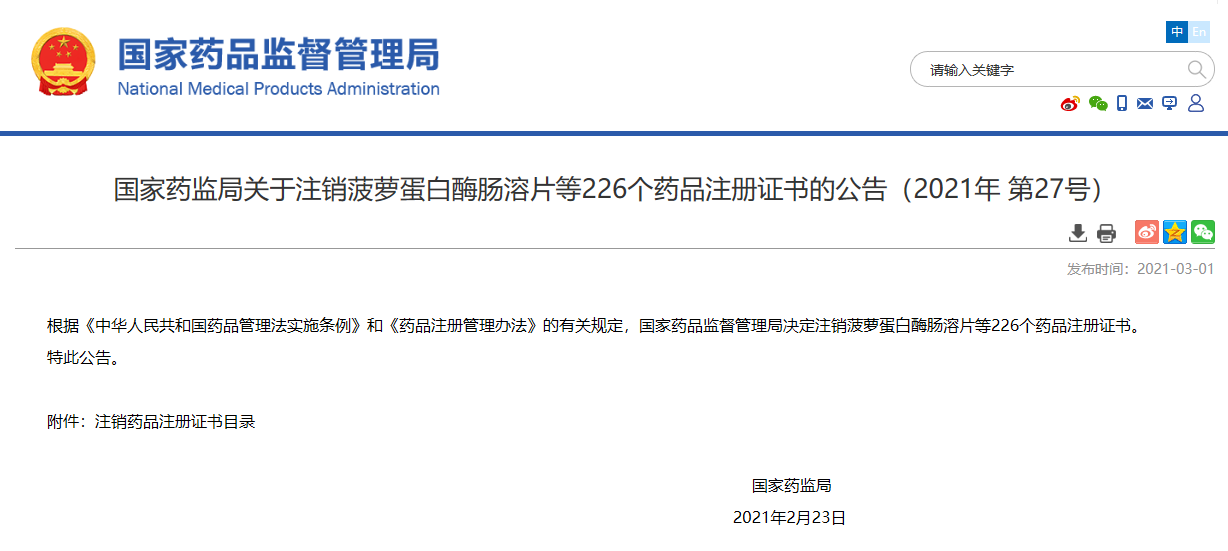 國(guó)家藥監(jiān)局關(guān)于注銷菠蘿蛋白酶腸溶片等226個(gè)藥品注冊(cè)證書(shū)的公告(2021年 第27號(hào))