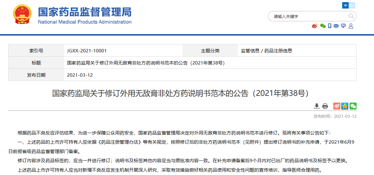 國家藥監(jiān)局關(guān)于修訂外用無敵膏非處方藥說明書范本的公告(2021年第38號)