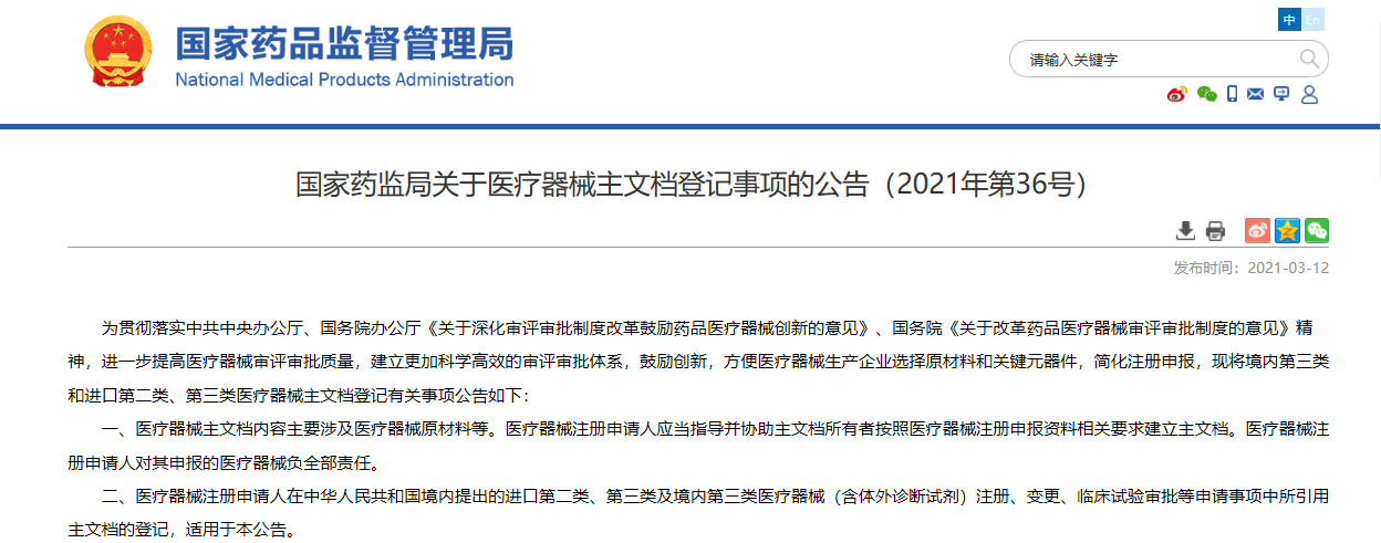 國家藥監(jiān)局關(guān)于醫(yī)療器械主文檔登記事項(xiàng)的公告(2021年第36號)