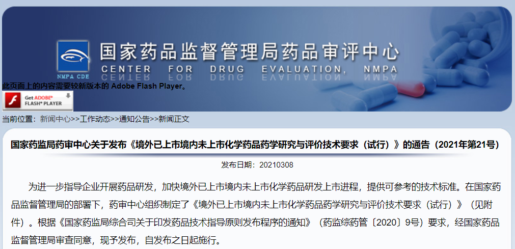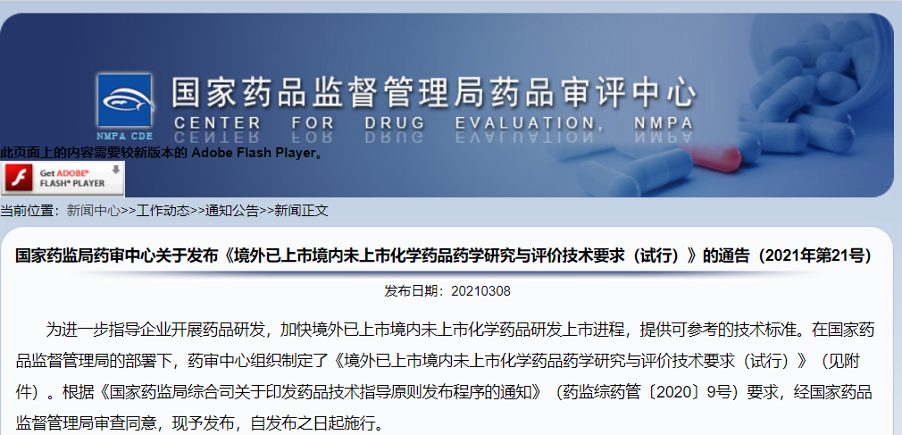 國家藥監(jiān)局藥審中心關(guān)于發(fā)布《境外已上市境內(nèi)未上市化學(xué)藥品藥學(xué)研究與評價(jià)技術(shù)要求(試行)》的通告(2021年第21號)