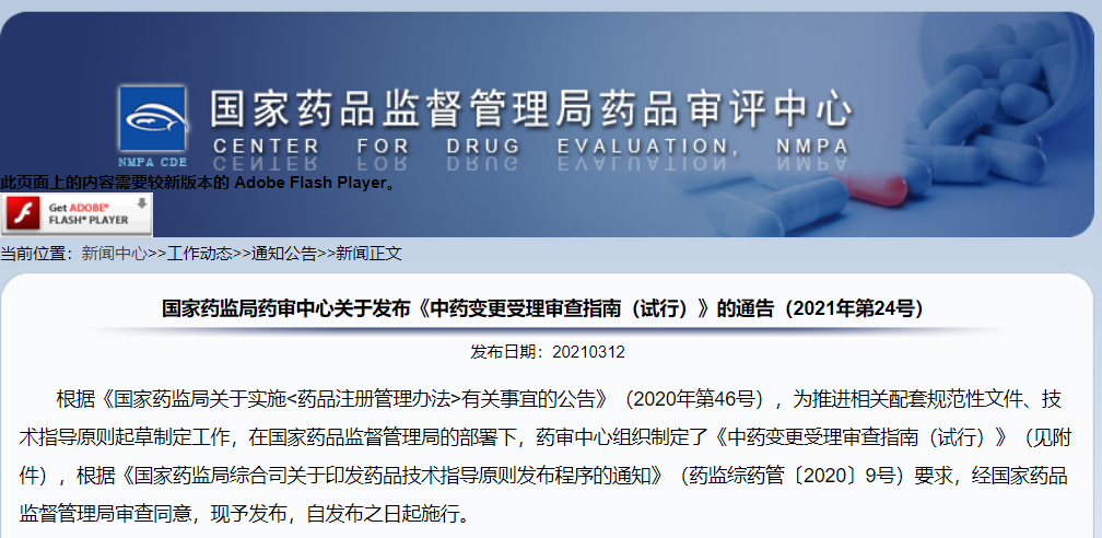 國家藥監(jiān)局藥審中心關(guān)于發(fā)布《中藥變更受理審查指南(試行)》的通告(2021年第24號)