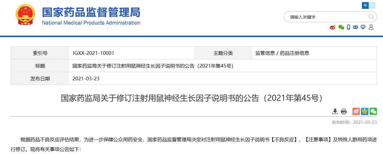 國家藥監(jiān)局關(guān)于修訂注射用鼠神經(jīng)生長因子說明書的公告(2021年第45號)