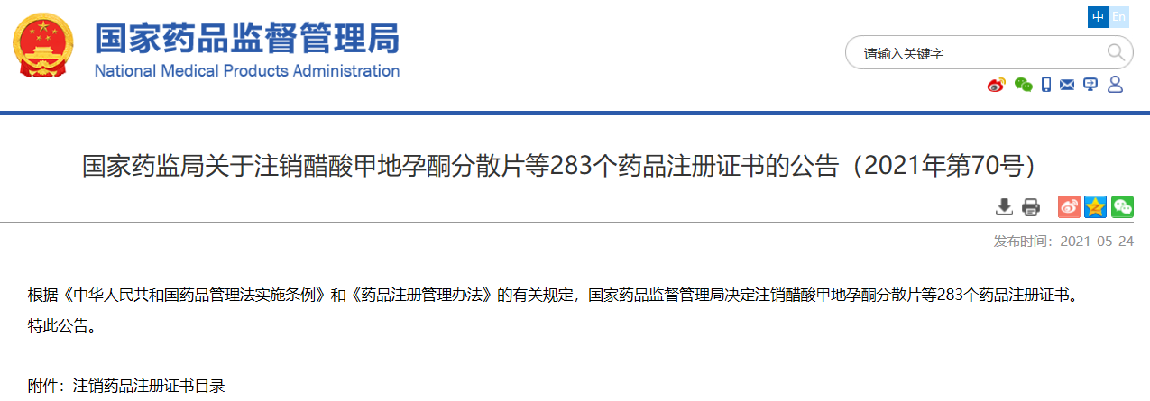 國家藥監(jiān)局關(guān)于注銷醋酸甲地孕酮分散片等283個藥品注冊證書的公告(2021年第70號)
