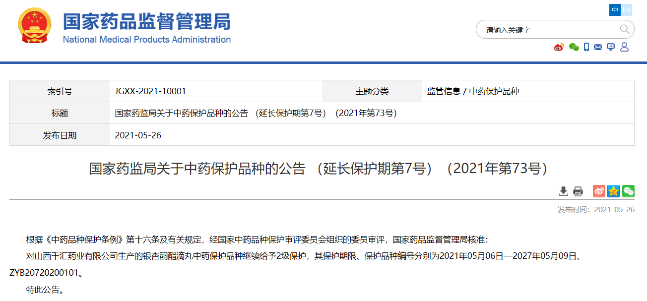 國家藥監(jiān)局關(guān)于中藥保護(hù)品種的公告 (延長保護(hù)期第7號)(2021年第73號)