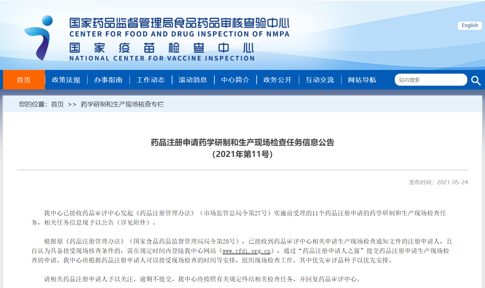 藥品注冊申請藥學(xué)研制和生產(chǎn)現(xiàn)場檢查任務(wù)信息公告(2021年第11號)