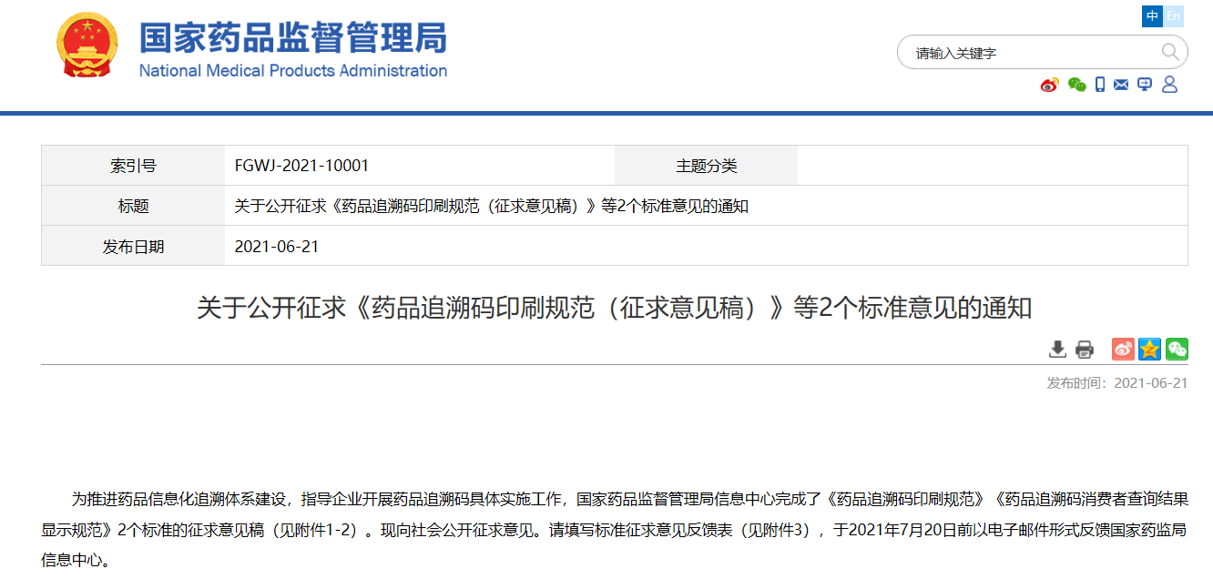 關(guān)于公開征求《藥品追溯碼印刷規(guī)范(征求意見稿)》等2個(gè)標(biāo)準(zhǔn)意見的通知