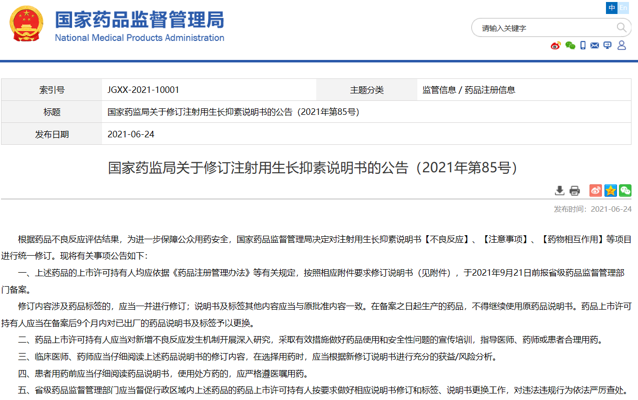 國家藥監(jiān)局關(guān)于修訂注射用生長抑素說明書的公告(2021年第85號)