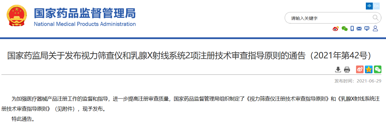 關(guān)于發(fā)布視力篩查儀和乳腺X射線系統(tǒng)2項(xiàng)注冊(cè)技術(shù)審查指導(dǎo)原則的通告(2021年第42號(hào))