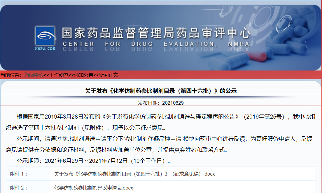 關(guān)于發(fā)布《化學(xué)仿制藥參比制劑目錄(第四十六批)》的公示
