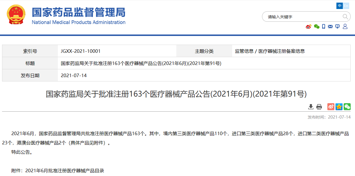 關(guān)于批準注冊163個醫(yī)療器械產(chǎn)品公告(2021年6月)(2021年第91號)