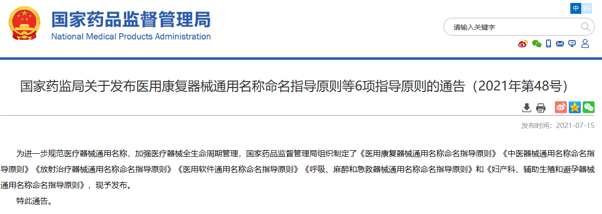 關(guān)于發(fā)布醫(yī)用康復器械通用名稱命名指導原則等6項指導原則的通告(2021年第48號)