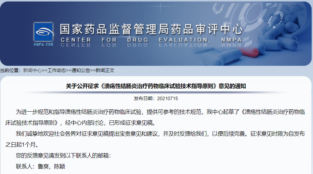 關(guān)于公開征求《潰瘍性結(jié)腸炎治療藥物臨床試驗技術(shù)指導原則》意見的通知