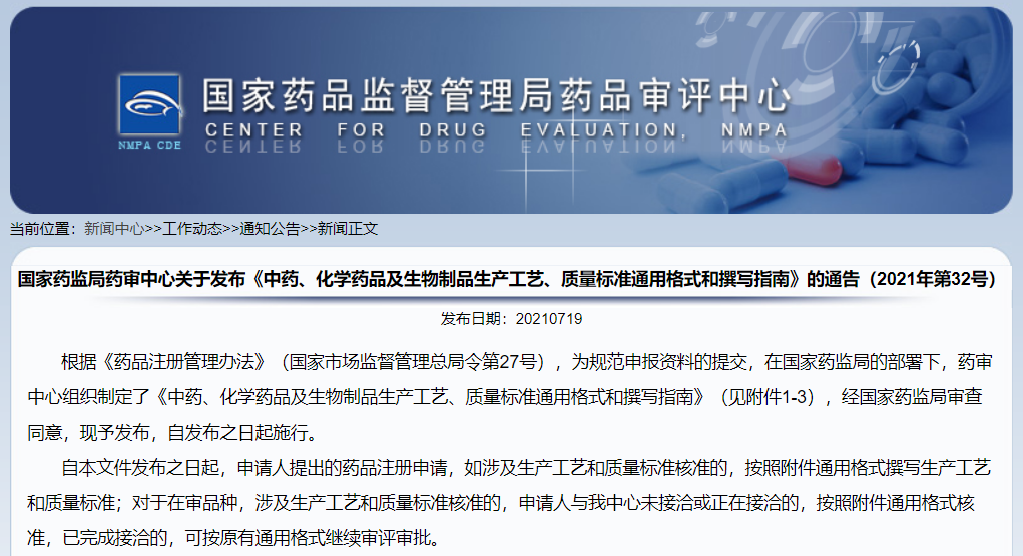 關(guān)于發(fā)布《中藥、化學(xué)藥品及生物制品生產(chǎn)工藝、質(zhì)量標(biāo)準(zhǔn)通用格式和撰寫(xiě)指南》的通告(2021年第32號(hào))