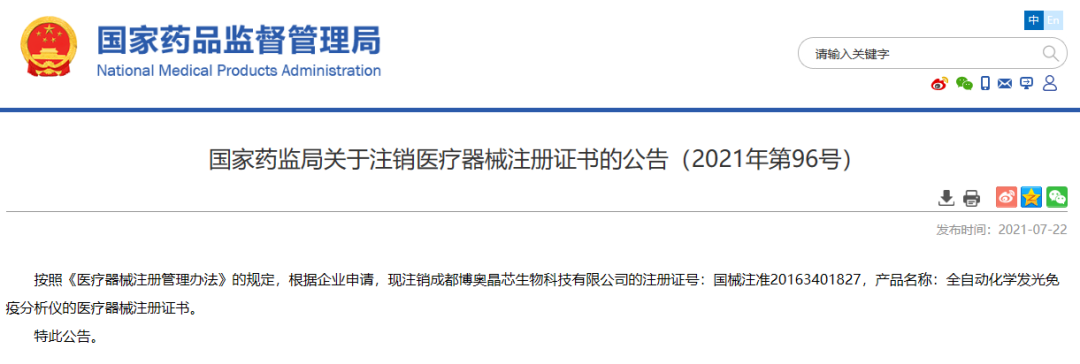 國(guó)家藥監(jiān)局關(guān)于注銷(xiāo)醫(yī)療器械注冊(cè)證書(shū)的公告(2021年第96號(hào))