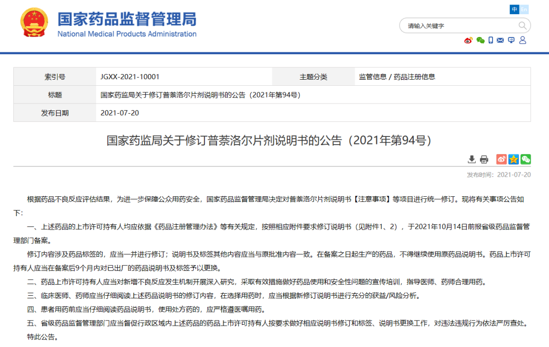 關(guān)于修訂普萘洛爾片劑說(shuō)明書(shū)的公告(2021年第94號(hào))