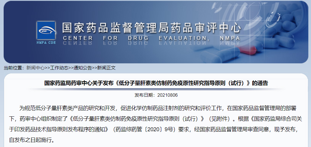 關于發(fā)布《低分子量肝素類仿制藥免疫原性研究指導原則(試行)》的通告