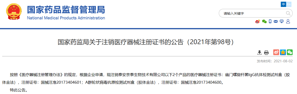 關于注銷醫(yī)療器械注冊證書的公告(2021年第98號)