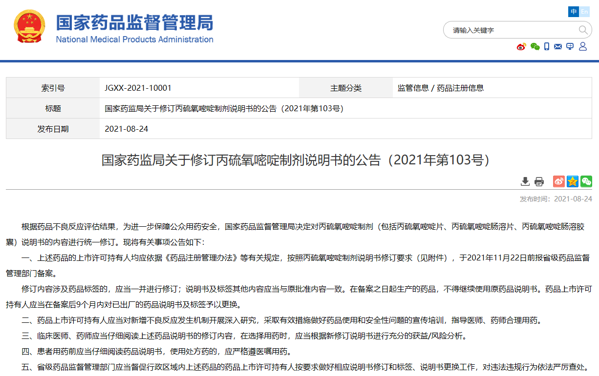 關(guān)于修訂丙硫氧嘧啶制劑說(shuō)明書(shū)的公告(2021年第103號(hào))