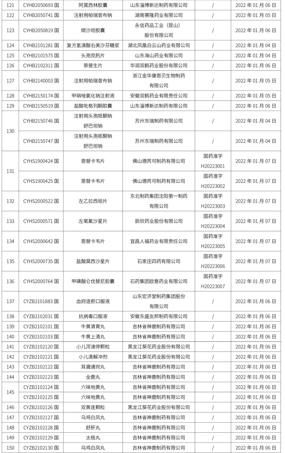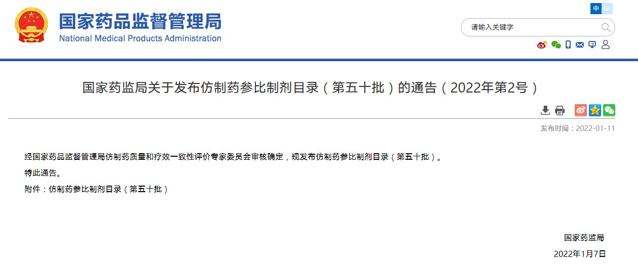 國家藥監(jiān)局關(guān)于發(fā)布仿制藥參比制劑目錄(第五十批)的通告(2022年第2號)