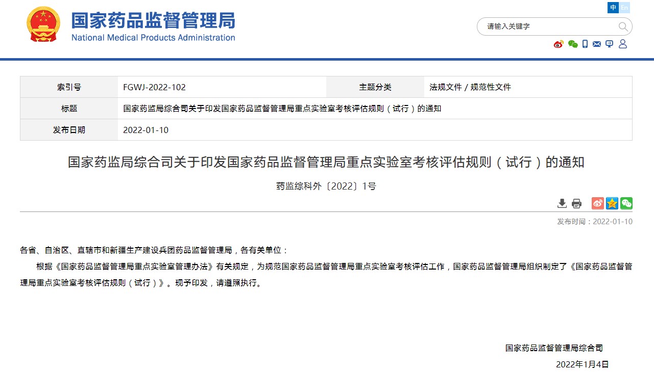 國家藥監(jiān)局綜合司關(guān)于印發(fā)國家藥品監(jiān)督管理局重點(diǎn)實(shí)驗室考核評估規(guī)則(試行)