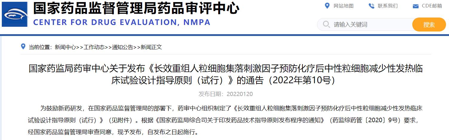 國家藥監(jiān)局藥審中心關(guān)于發(fā)布《長效重組人粒細胞集落刺激因子預防化療后中性粒細胞減少性發(fā)熱臨床試驗設(shè)計指導原則(試行)》的通告(2022年第10號)