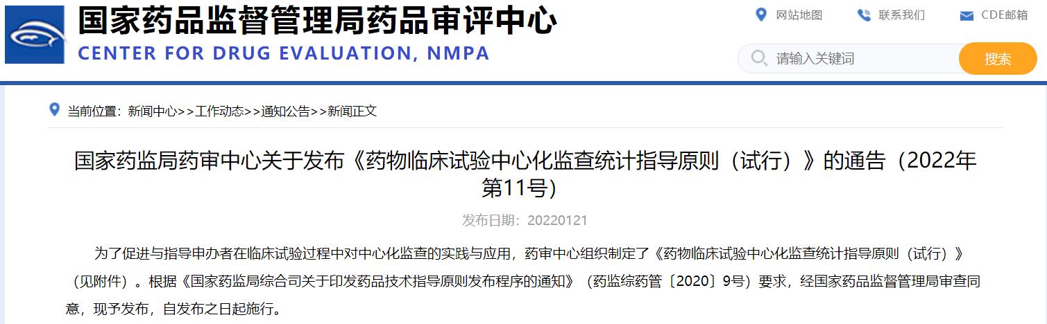 國家藥監(jiān)局藥審中心關(guān)于發(fā)布《藥物臨床試驗中心化監(jiān)查統(tǒng)計指導原則(試行)》的通告(2022年第11號)