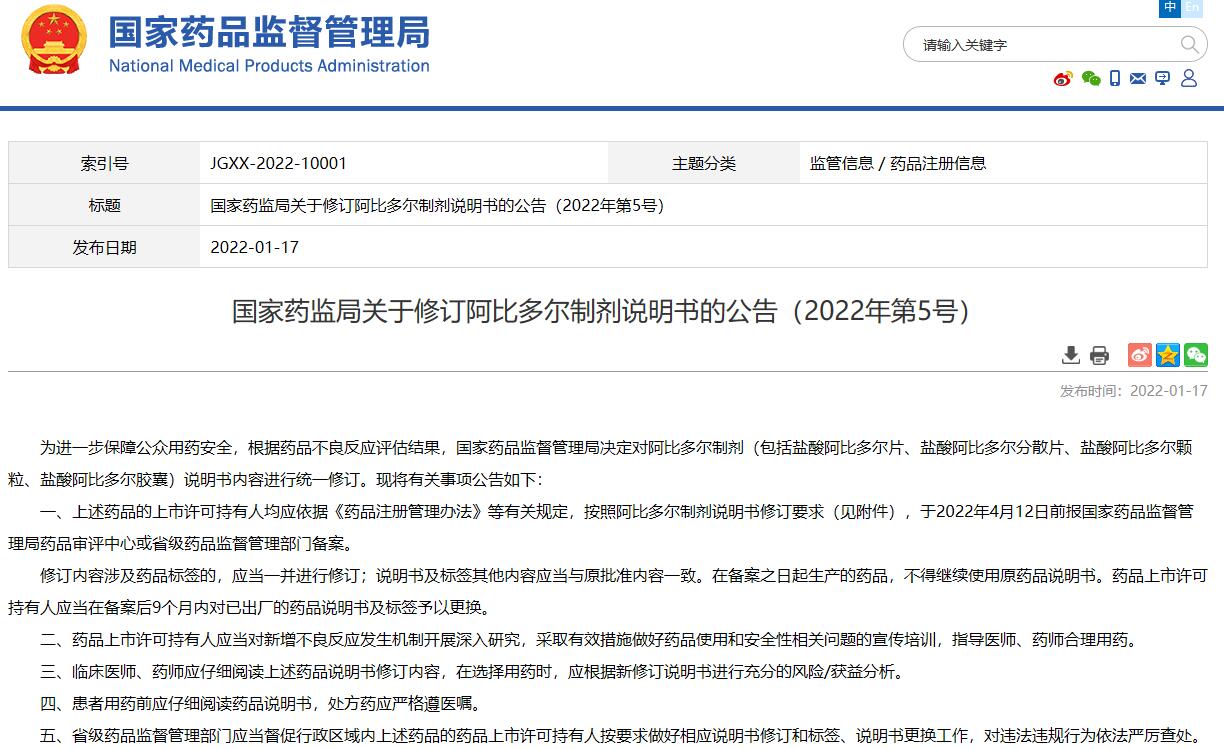 國家藥監(jiān)局關(guān)于修訂阿比多爾制劑說明書的公告(2022年第5號)