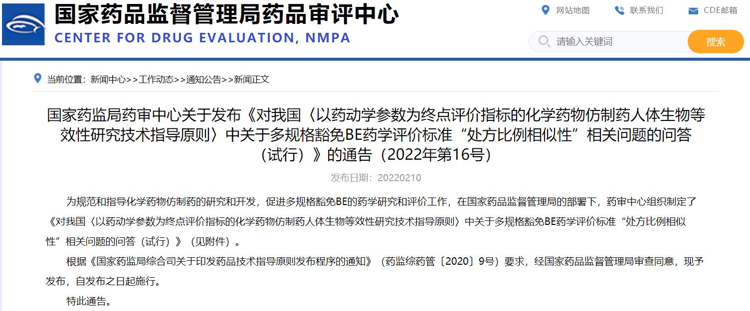 國家藥監(jiān)局藥審中心關(guān)于發(fā)布《對我國〈以藥動學(xué)參數(shù)為終點評價指標(biāo)的化學(xué)藥物仿制藥人體生物等效性研究技術(shù)指導(dǎo)原則〉中關(guān)于多規(guī)格豁免BE藥學(xué)評價標(biāo)準(zhǔn)“處方比例相似性”相關(guān)問題的問答(試行)》的通告(2022年第16號)