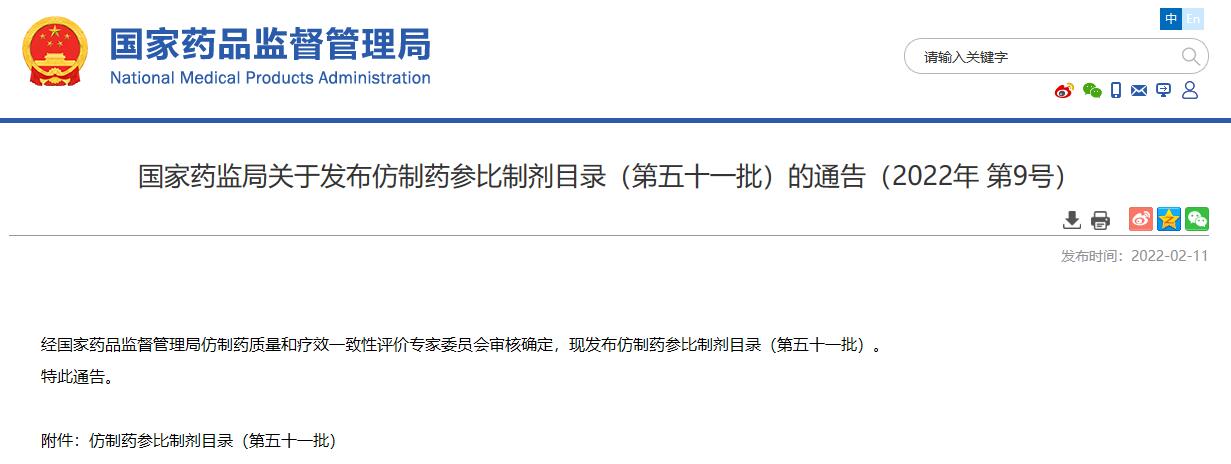 國家藥監(jiān)局關(guān)于發(fā)布仿制藥參比制劑目錄(第五十一批)的通告(2022年 第9號)