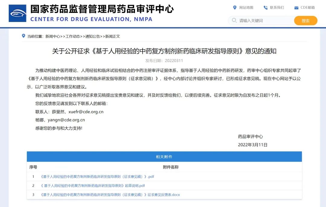 關(guān)于公開征求《基于人用經(jīng)驗的中藥復方制劑新藥臨床研發(fā)指導原則》意見的通知