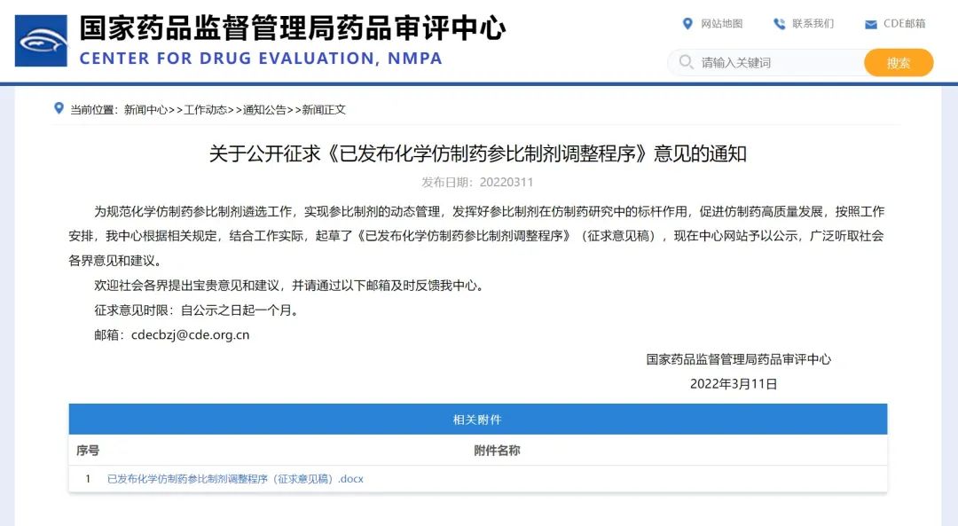 關(guān)于公開征求《已發(fā)布化學仿制藥參比制劑調(diào)整程序》意見的通知