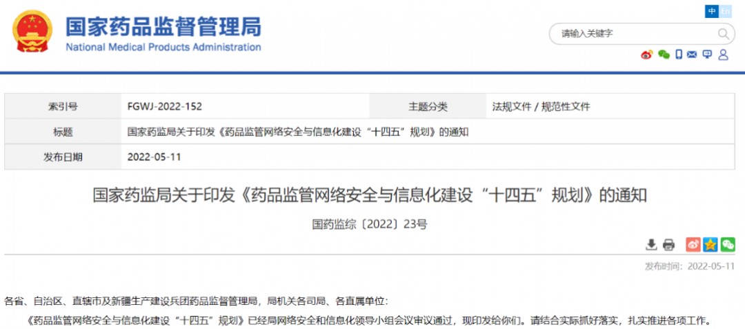國家藥監(jiān)局關(guān)于印發(fā)《藥品監(jiān)管網(wǎng)絡(luò)安全與信息化建設(shè)“十四五”規(guī)劃》的通知